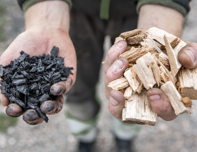 Biokullet kommer fra Norges første kommersielle biokullfabrikk, Oplandske Bioenergi, som åpnet i Ringsaker kommune høsten 2021. De produserer biokull av flis fra trevirke. Foto: Corinne Schneider, Sirkula