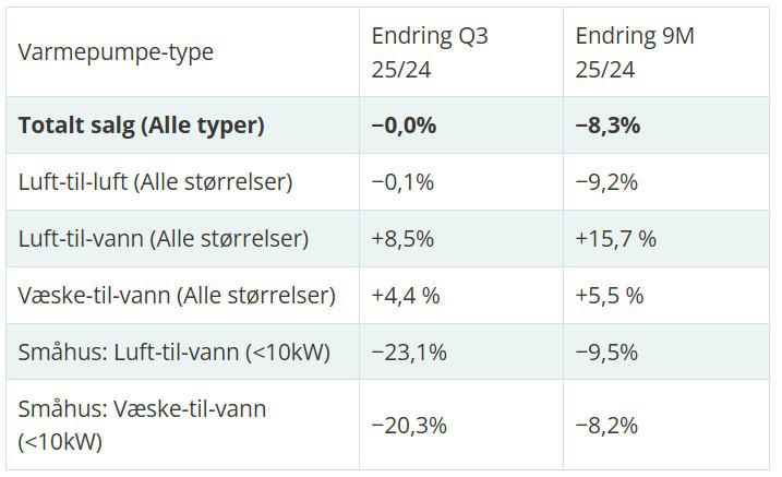 - Salget av luft-til-vann-varmepumper under 10 kW falt med −23,1% i Q3, og ligger −9,5% bak fjoråret kumulativt.